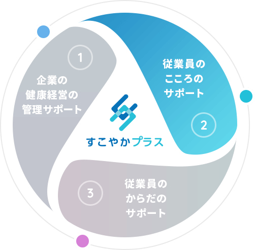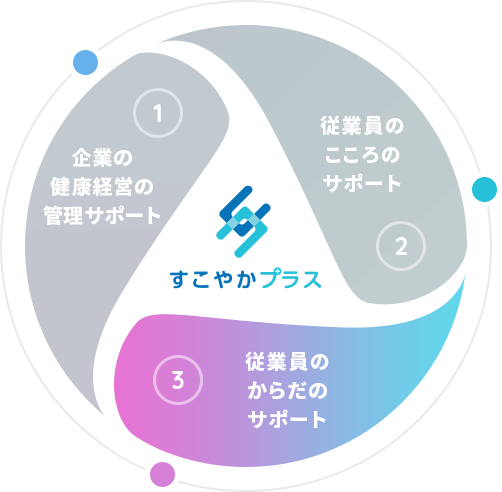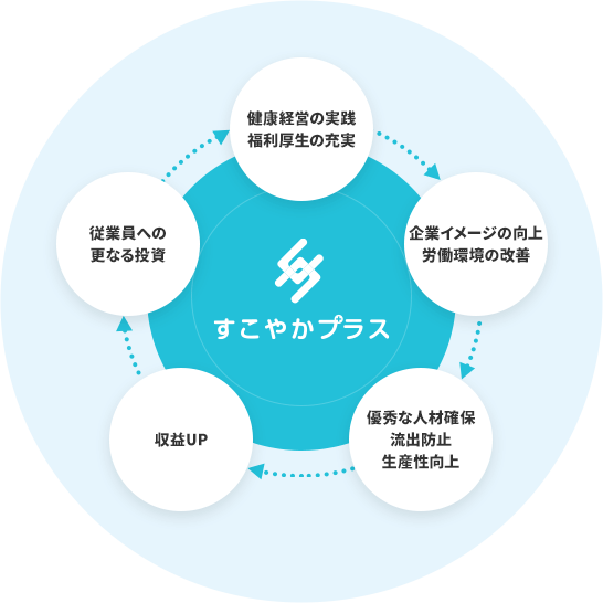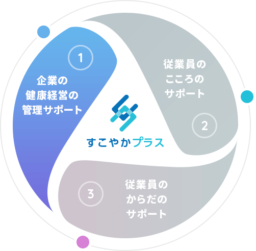 すこやかプラスは、中小企業が経営課題に取り組むにあたって必要な3つの構成要素をオールインワンパッケージにして提供する健康経営・福利厚生支援サービスです。健康経営優良法人(中小規模法人部門)の認定要件に沿ったサービス設計となっており、知識やノウハウがなくても健康経営の実践が可能です。このサービスは管理者用と従業員用のWEBサイトをそれぞれ用意しています。