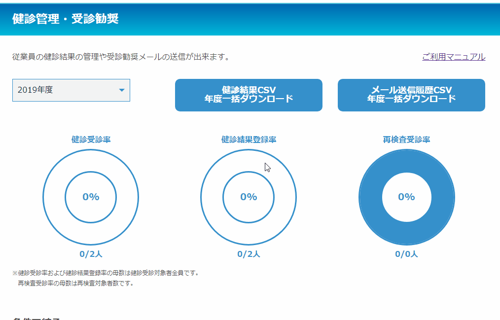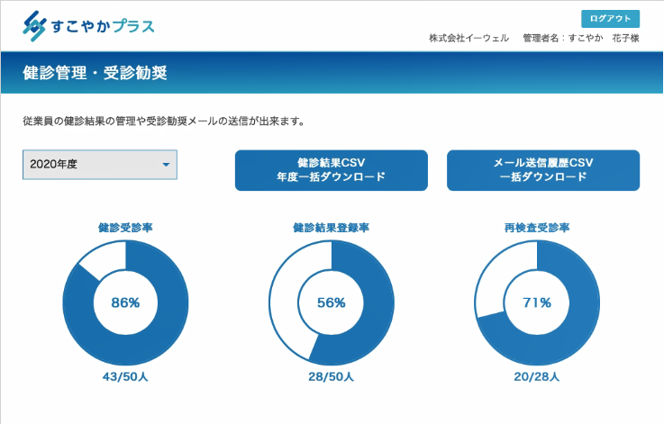 セキュアな環境にて、経年で従業員の健診結果を管理することが可能です。また未受診・未登録者に対してメールで健診受診・登録を促すことができます。