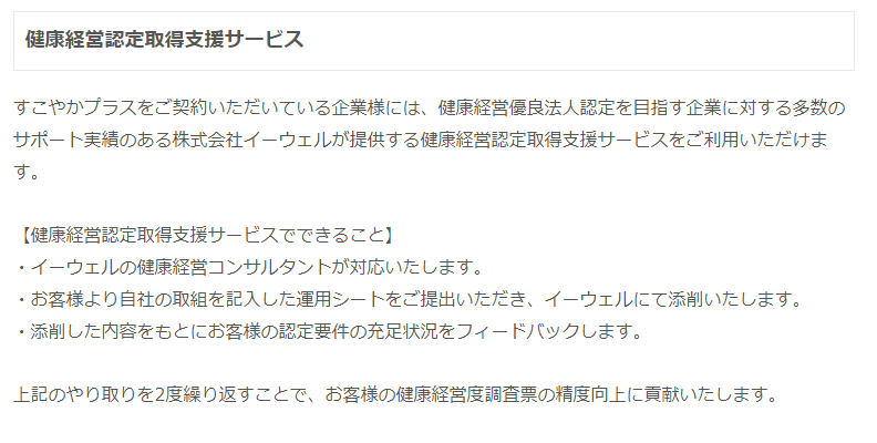 健康経営優良法人の認定取得に際して、お客様の健康経営度調査票の添削を致します。また添削内容をもとにお客様の認定要件充足状況をフィードバックいたします。【有料オプション】